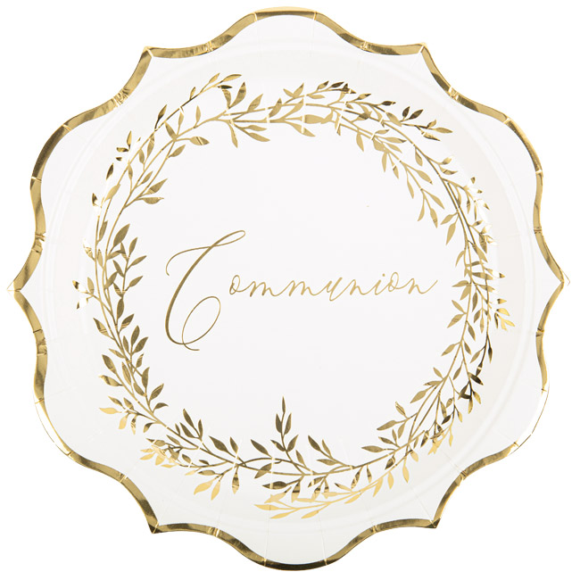 Chic, originales et élégantes, ces grandes assiettes Communion blanc et doré aux bords dorés avec leur superbe couronne végétale dorée sont en carton rigide et jetables et seront magnifiques sur vos tables de communion. Elles seront idéales pour toutes vos décorations de table sur le thème champêtre, thème doré gold chic. Nos grandes assiettes jolis brins communion peuvent être utilisées pour vos entrées, plats, desserts, buffets... N'hésitez pas à les assortir avec nos autres produits blanc doré, ces assiettes sont tellement belles qu'elles s'accorderont avec tous vos coloris !