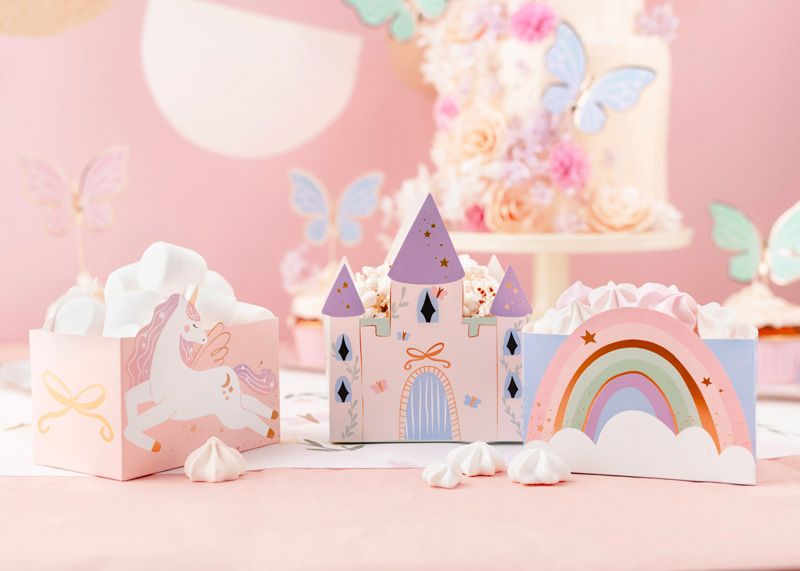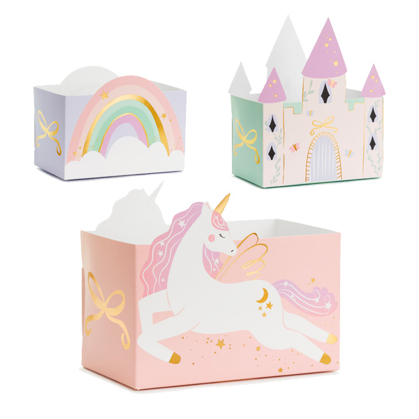 Parfaites pour un anniversaire licorne féerique, ces boîtes à goûter château et licornes en papier ajoutent une touche magique à votre table. Avec leurs couleurs pastel et leurs illustrations douces, elles sont idéales pour présenter bonbons, biscuits ou petites surprises. Le lot contient 6 boîtes différentes à monter soi-même après pliage, parfaites pour compléter une décoration anniversaire licorne délicate et enchantée.