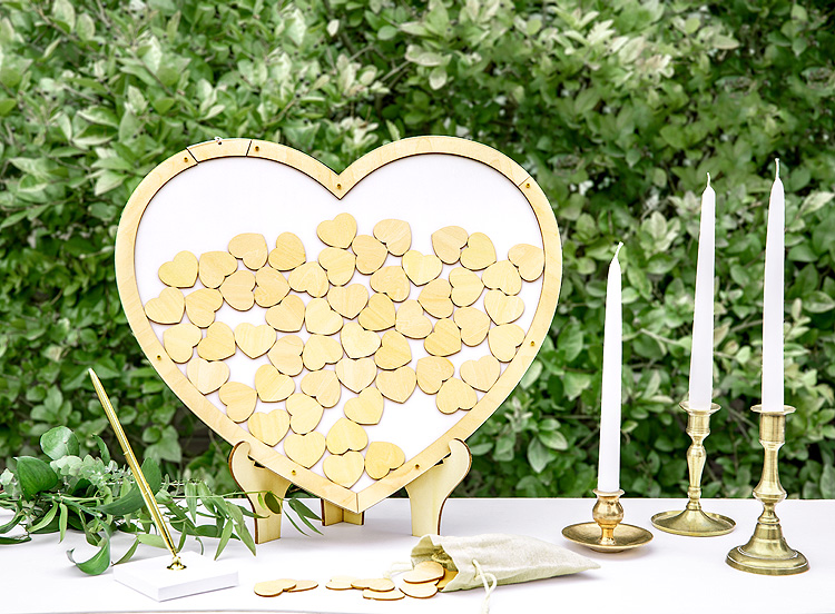 Absolument magnifique et très original, ce livre d'or mariage cadre coeur en bois sur chevalet, est livré avec 70 petits coeurs en bois sur lesquels vos invités viendront inscrire un petit mot, puis glisseront le petit coeur dans le cadre dans la fente prévue à cet effet sur le dessus ! Vous garderez à tout jamais ce joli cadre livre d'or original comme objet de déco, les coeurs pourront être rangés dans le petit pochon en lin livré avec. Coup de coeur assuré !