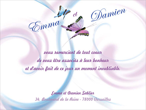 Les cartes de remerciement classiques Sachez tout d"abord qu'en règle générale, il est conseillé d'envoyer vos cartes de remerciements à vos invités dans le mois qui suit le jour de votre mariage. Avant de vous creuser les méninges pour trouver le message à faire imprimer sur vos cartes, choisissez déjà votre modèle de carte de remerciement. Vous rédigerez alors le texte en fonction de l'espace disponible. Il est fortement conseillé de prendre des cartes de remerciement de la même collection que vos faire-part de mariage pour prolonger ce moment innoubliable. Attention de ne pas oublier de remercier tous les gens présents lors de votre mariage ! Vous pouvez aussi choisir de faire imprimer deux séries de cartes : une série de cartes pour les invités ayant simplement assister à la cérémonie, et une série de cartes pour les invités ayant assister à toutes les festivités et vous ayant offert un cadeau. Texte carte remerciement mariage classique : Bénédicte et Paulin Ont été très touchés par la délicate attention que vous avez témoignée à l'occasion de leur mariage. Modèles de carte de remerciement mariage classique : Pluie de Roses Honeymoon Saint Valentin L'Echange Texte carte remerciement de mariage traditionnel : Paul & Virginie Vous remercient de la délicate attention que vous avez témoignée à l'occasion de leur mariage. Ils vous envoient leur plus affectueuse pensée. Paul & Virginie Lepetit 3, rue des Coquelicots 59600 Lille Modèles de carte de remerciement mariage traditionnel : Le Rafia La Valse Les Alliances Le Jour J Texte carte de remerciement mariage original : Nathalie & Loïc Vous remercient de tout coeur de vous être associés à leur bonheur et vous invitent à découvrir les plus belles photos de leur mariage sur le site www.plusbeaujourdelavie.fr Nathalie & Loïc Dumoulin 3, rue des Coquelicots 59600 Lille Modèles de carte remerciement mariage originales : Arabesques I Love You L'Avion Pluie de Plumes