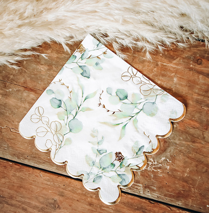 Serviettes Sauge Green Bordure Dorée x16 4.90 € Previous Next Disponibilité Reste 7 Expédié sous 24h Délai livraison 48h Qualité produit Avis clients Aucun avis Pour donner votre avis sur ce produit, vous devez dejà avoir commandé ce produit. Les informations sur le recueil de nos avis sont disponibles : ici. Pour vérification, veuillez saisir votre n° de commande et votre code postal : N° commande : Code Postal : Note de 1 à 5 : 5 étoiles 4 étoiles 3 étoiles 2 étoiles 1 étoile Tapez ici votre commentaire sur ce produit. Valider Quantité 1 2 3 4 5 6 7 Commander - Ref : 92345 - 16 serviettes sauge green. - Papier blanc soyeux tout doux. - Superbe motif floral sauge et eucalyptus vert pastel. - Bordure festonnée en forme de vague dorée. - Idéal thème champêtre, floral, végétal. - Papier double épaisseur - 3 plis. - Dimension pliée : 16,5 x 16,5 cm. - Dimension ouverte : 33 x 33 cm. - Idéales pour vos cocktails ou repas. Superbes, ces serviettes sauge green blanches avec leur motif feuillage végétal sauge et eucalyptus dans des verts très doux et pastels seront idéales pour vos décoration mariage de table. Ces serviettes sauge green avec leur magnifique bordure dorée seront parfaites pour un thème mariage végétal, botanique, vintage, ou un mariage champêtre. Ces serviettes jetables en papier sont assorties à nos autres accessoires mariage sauge green disponibles sur notre site : urne sauge green, assiettes sauge green, chemin de table sauge green, livre d'or...