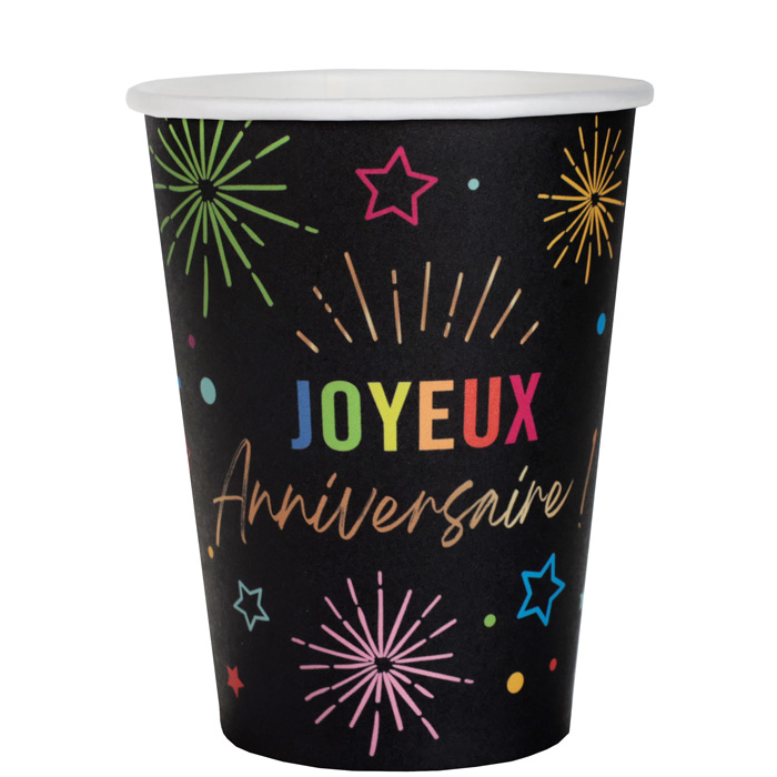 Ces superbes gobelets Joyeux Anniversaire noir multicolore pas chers avec leurs rebords très tendance seront indispensables et incassables pour vos cocktails, buffets et vos repas à table comme verre à eau. Ces beaux gobelets joyeux anniversaire noir festicolor à prix discount peuvent aussi être utilisés pour vos bars à bonbons, tables d'enfants. A remplir également de sucreries, bonbons, pop corn...